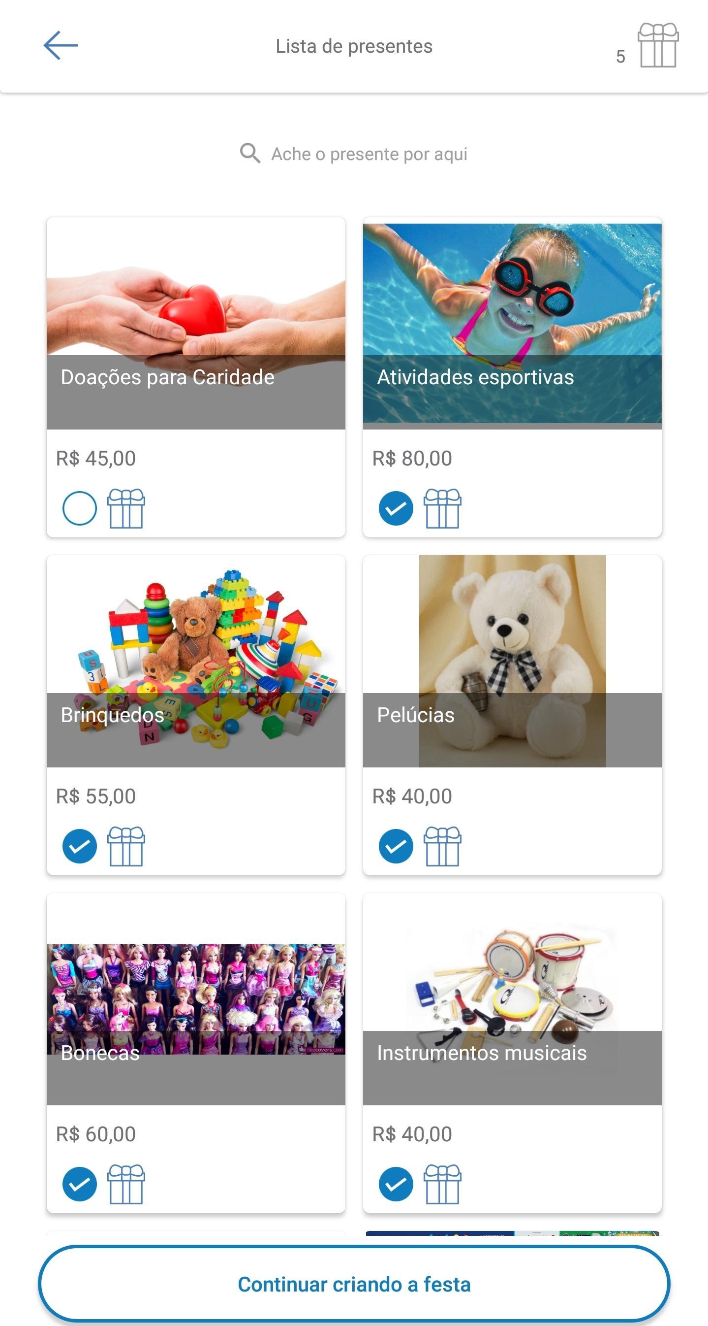 In the Baladinha , all gifts are virtual. After creating the party and selecting the gift list, you get a distribution link to the guests. You can send this link to your guests on WhatsApp, Facebook or any other kind of finding it more convenient.