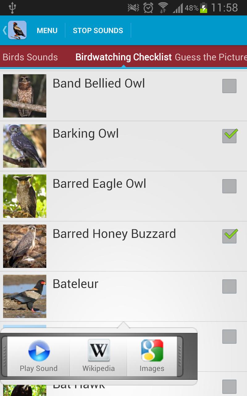 A Birdwatching checklist is included allowing you to tick off birds you have seen. Tapping on a bird on the checklist screen allows you to view more information about the bird on Wikipedia or perform an image search via Google images.
