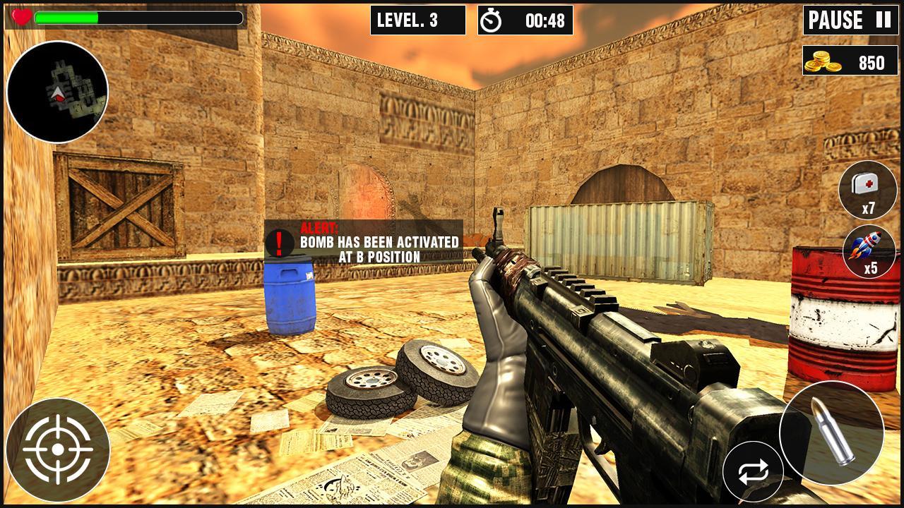 Player! Step into the battleground full of terrorists,plan for blitz attack,rescue your people by defuse the bomb.Keep steady Aim under heavy fire and strike out terrorists where bombs and grenades are exploding to destroy the peace of innocents for nothing.Real missions of Counter Terrorists with epic fps shooter game features.Shoot down your enemies by auxiliary weapons,use every sort of weapon for your survival.Its your call Player! Fulfill your duty to be the commando of this Critical Strike & counter terrorists missions game.