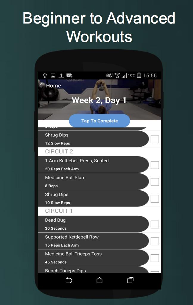 The app begins with a lower intensity (stabilization endurance) program to first address potential muscle imbalances and improve joint stability and mobility. Higher levels then utilize a aggressive power training regimen. Additionally, cardiorespiratory exercises are included.