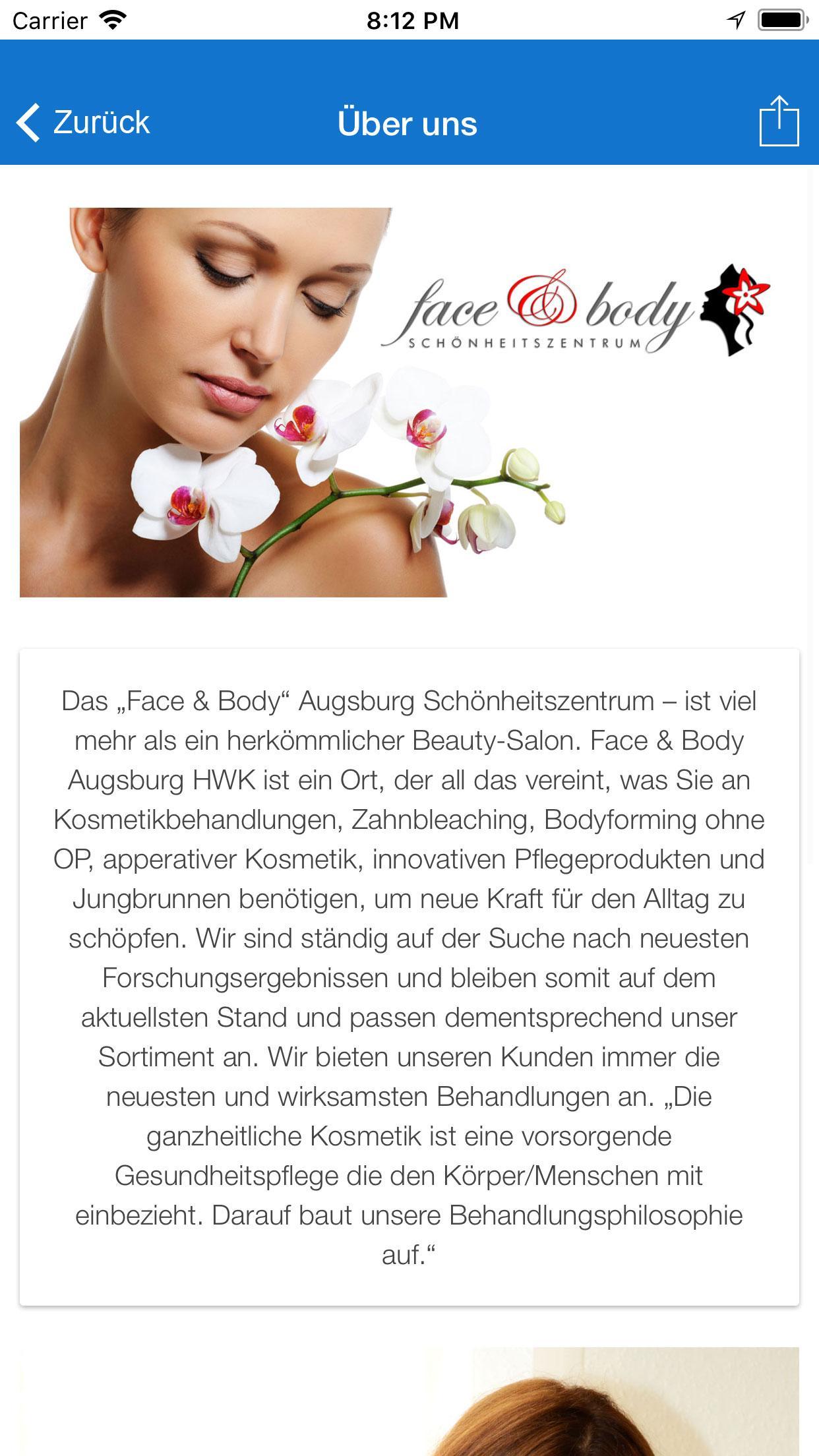 The "Face & Body" Augsburg beauty center-is much more than a conventional beauty salon. Face & Body Augsburg HWK is a place that combines everything that you need in cosmetic treatments, tooth bleaching, body forming without surgery, apparentive cosmetics, innovative care products and fountain for everyday life.