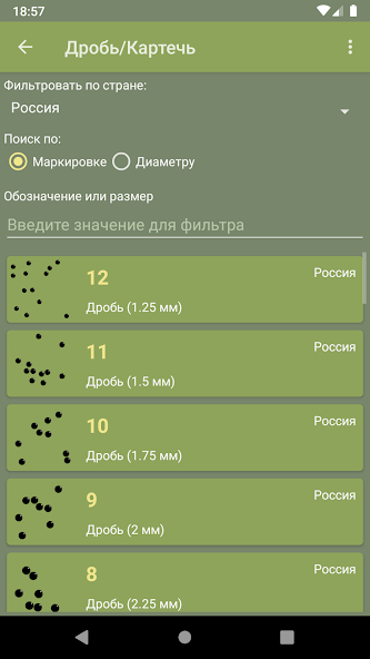 ✔ Reference information on the types of shot and buckshot (weight and diameter of pellets, markings), types of markings of the shot (buckshot) and their correspondence with each other;
