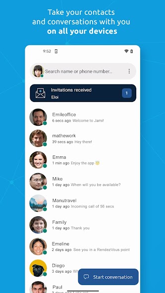 One-to-one and group conversations with Jami are enhanced with instant messaging, audio and video calling, recording and sending audio and video messages, file transfers, screen sharing, and location sharing.