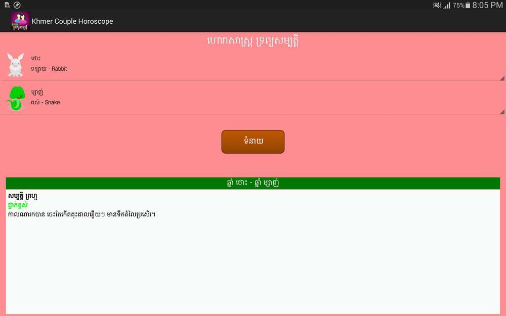 Khmer Couple Horoscope provide user the information related to their couple life whether it is good or not base your birth animal year.