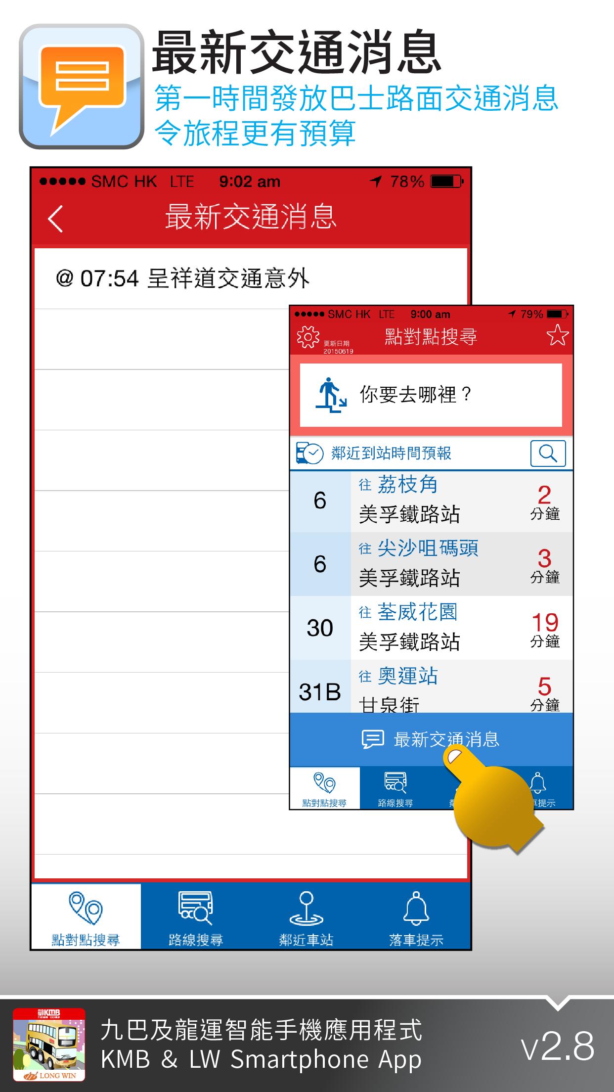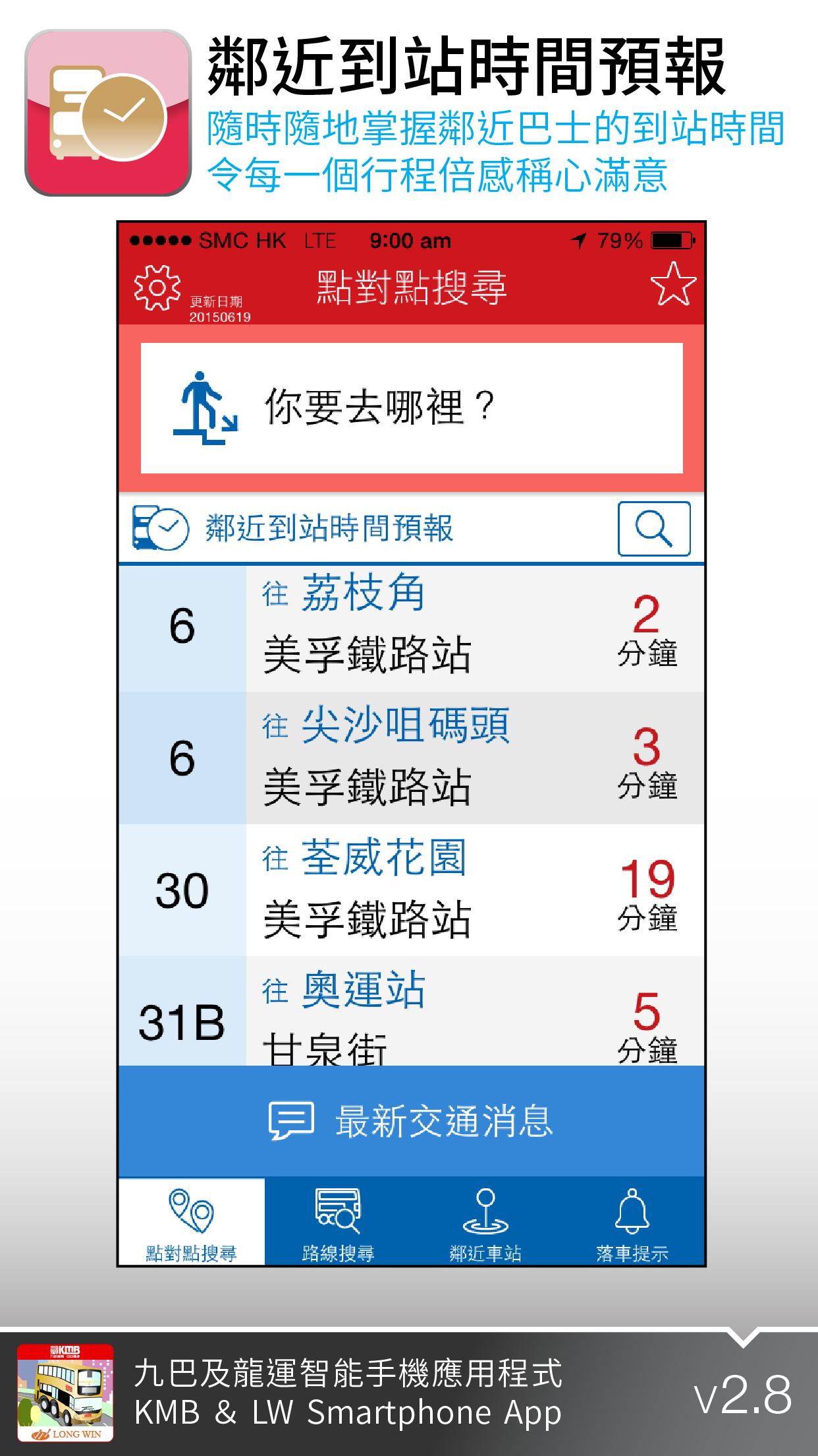 The KMB & LWB Smartphone App is a multi-functional app which provides users with the estimated bus arrival time, updates on bus services and the latest route information to help with journey planning.