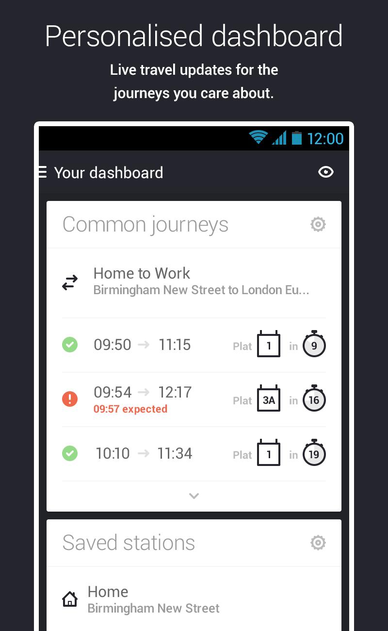 • Customise the app to save and display train times, service updates and platform information for regular journeys you make