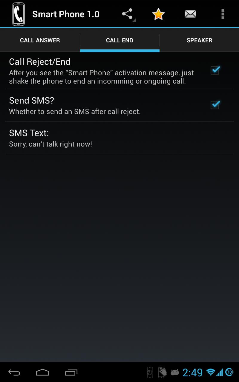 ✔ Automatically send an SMS when rejecting a call by shake;