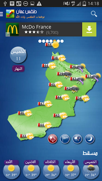 Oman Weather app provides accurate weather forecasts (wind, humidity, tides, solunar activity, ephemeris, alerts) cities in Oman for seven coming days.