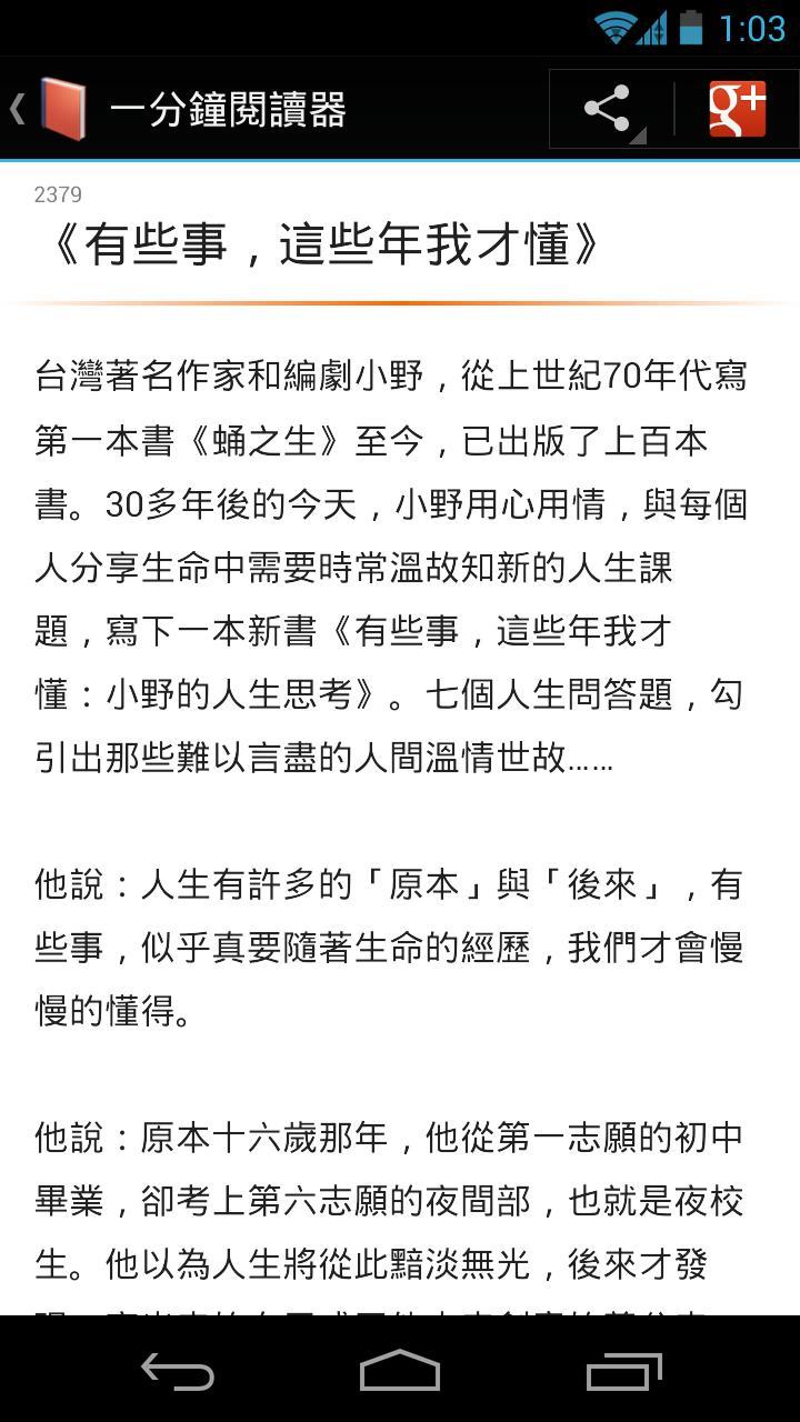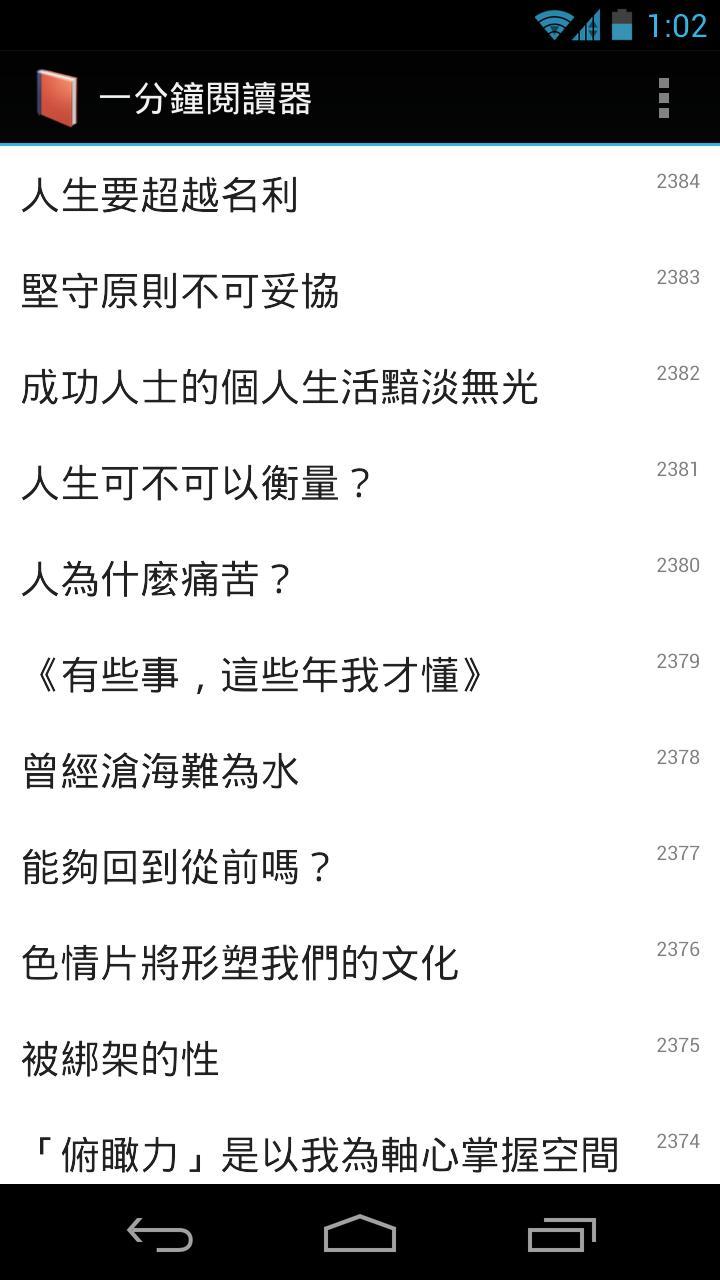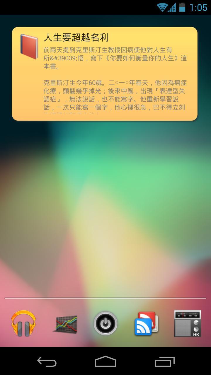Articles from the RTHK programme "一分鐘閱讀". Widget and notification are available. Expandable notification in Jelly Bean supported.