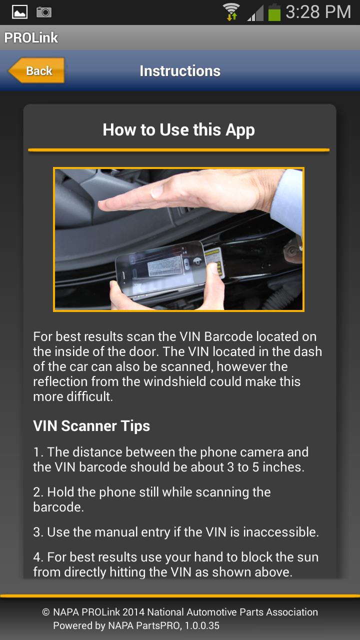 If you have questions about NAPA VIN Capture app, please call NAPA PROLink Support MON - SAT at 1-800-361-8977