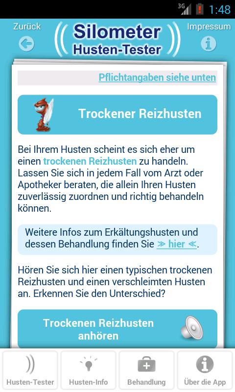 The coughing plague only has to cough in the microphone of his smartphone, after which the specially programmed software analyzes the coughing ore and gives an initial assessment whether it could be a dry cough or rather a productive cough. The diagnosis by the doctor or advice in the pharmacy cannot of course replace the silometer test result. Only the doctor and pharmacist alone can reliably assign and treat the cough.