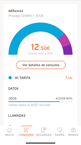 - Consumption for the current month: shows the euros, megabytes and minutes you have used. If you also have bonuses, you will see your consumption in the new bar graphs. You can also consult the graphs with the details of the MB/MIN spent per day and the estimate of what you will consume until the end of the cycle.