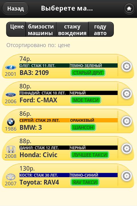 We take all the taxi of the city and open for them free registration. At the time when you decide to use our service, we will provide you with the current list of all the free cars of the city, we will even calculate the total sum of your trip for each car, and it will look like you would call 100500 taxi of your city in a moment and asked at the cost of your trip. Then we will maximize the cost of your trip for each car, based on its personal proximity to you. Then we will sort all the cars: