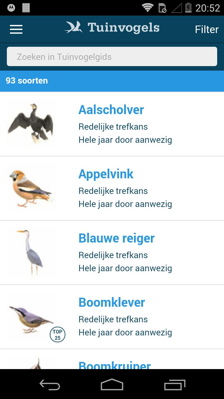 With this app you can recognize the 93 most common Tuinvogels in the winter on the basis of beautiful illustrations, clear descriptions and bird song. With the app you can also easily participate in the national garden bird count, the largest nature research in the Netherlands.
