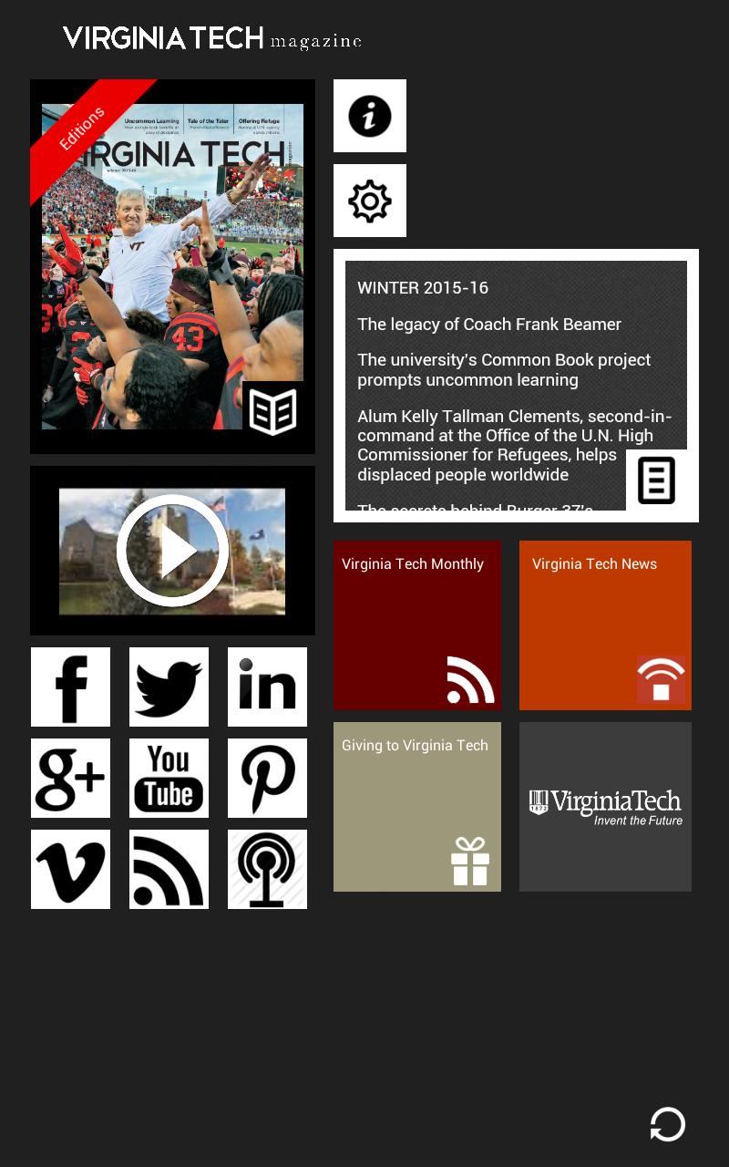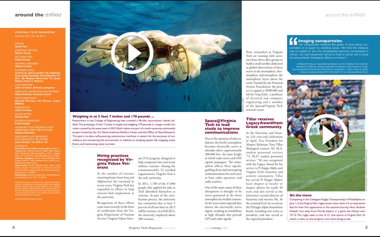 Virginia Tech Magazine, the university's flagship publication, forges stronger relationships among alumni, donors, and friends of Virginia Tech. Through a rich array of feature stories, alumni profiles, and university and alumni news, the magazine highlights the vibrancy of a university positioned on the leading edge of technology, service, learning, research, and scholarship and showcases the achievements of alumni, faculty and staff, and students.