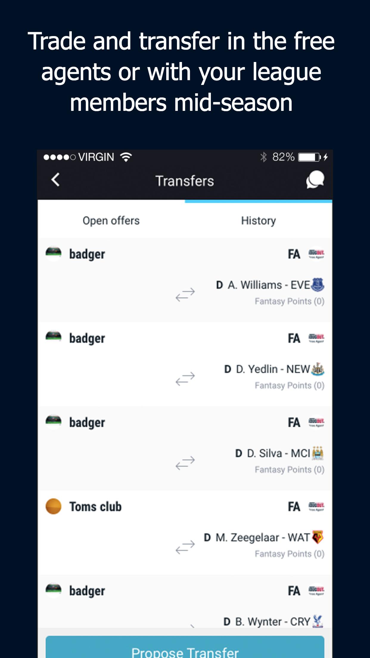 Dugout FC هي لعبة كرة القدم الخيالية الوحيدة التي تعكس كرة القدم في العالم الحقيقي. يعني تنسيق مشروعنا أن هناك حقًا واحد من كل لاعب في كل دوري. ابدأ موسمك مع حدث ليلي مسود ، واختر فريق اللاعبين الخاص بك من أجل منافسيك وحدد تشكيتك البداية كل أسبوع لمعركتك ضد عضو آخر في الدوري.