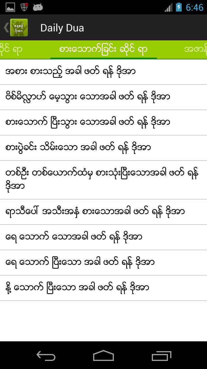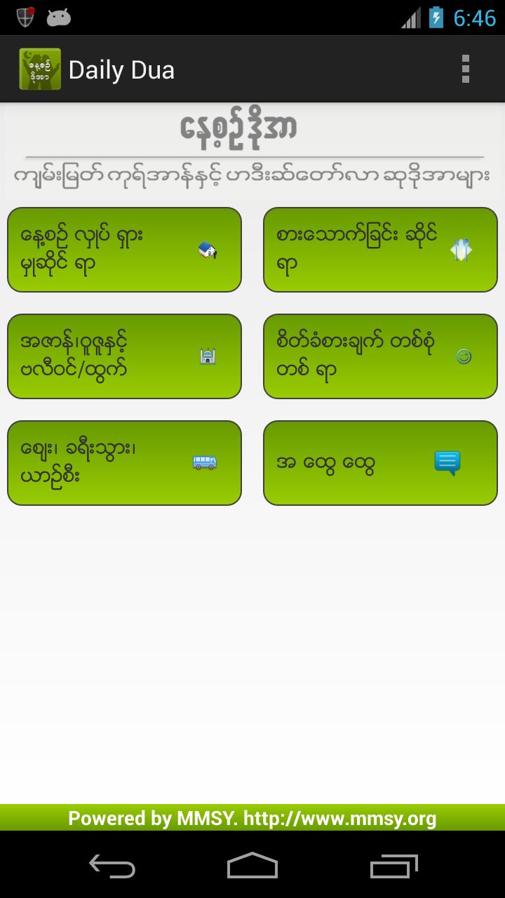 Dies ist eine DUA -Anwendung in Myanmar Language, die eine Zusammenstellung von 50 am häufigsten verwendeten Duas in unserem täglichen Leben ist, zusammen mit arabischem Text, Myanmar Tajwid, Bedeutung, Beschreibung und Referenzen. Sie können die DUAS nach Kategorien durchsuchen und Ihre Lieblings -Duas in einer separaten Liste speichern. Die ursprünglichen Quellen dieser App stammen aus einigen Hadithen und Büchern, die in die Sprache von Myanmar übersetzt wurden. Dies ist ein Projekt, das von MMSY (Myanmar Muslim Students and Youths) Community beigetragen hat.