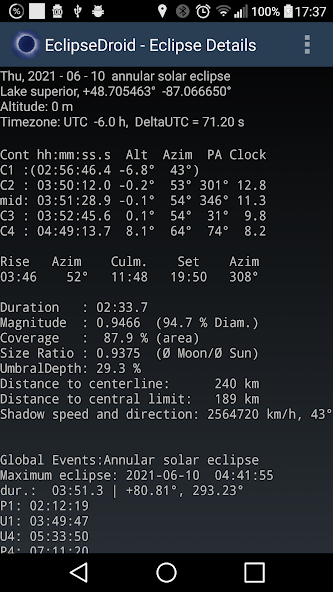 Eclipsedroid verfügt über mehrere Bildschirme und Layouts, um die genauen Kontaktzeiten für Ihren Standort anzuzeigen. Dies sind der Beginn und das Ende der Sonnenfinsternis (C1 und C4), der Beginn und das Ende der Gesamt- oder jährlichen Phase (C2 und C3), die Zeit der mittleren Sonnenfinsternis und der aktuelle Prozentsatz der Abdeckung der Sonnenscheibe. Sie haben die Auswahl von zwei Layouts: ein intelligentes Layout, das die lokalen Umstände und eine Animation der Sonnenfinsternis in kondensierter Form oder das klassische Layout mit Countdowns für alle Kontakte, einer Ereignisliste mit den nächsten bevorstehenden Ereignissen und der tatsächlichen Eclipse -Ansicht zeigt, wenn die Sonnenfinsternis ausgeführt wird.