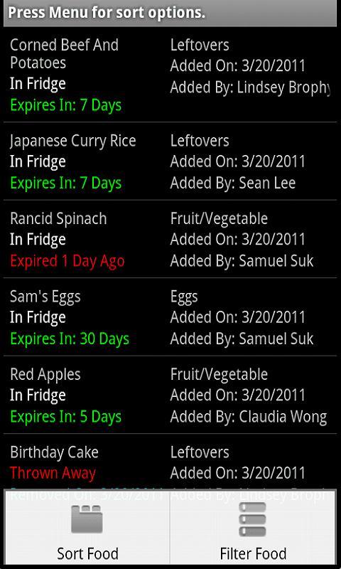 - Nahrung und Sortier nach Datum, Ablauf und Namen anzeigen