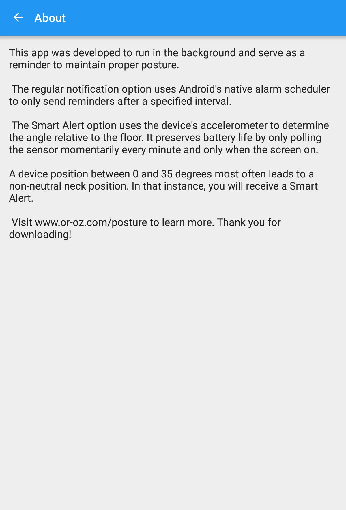 Ich stellte fest, dass der beste Weg zur Verbesserung der Haltung mit ständiger Verstärkung besteht. Mit der App „ Posture Reminder “ können Sie einfache, bequeme Erinnerungen festlegen, die jederzeit im Hintergrund arbeiten. Bitte bewerten Sie und hinterlassen Sie Feedback, damit ich mich so schnell wie möglich bei Ihnen melden kann. Danke schön.
