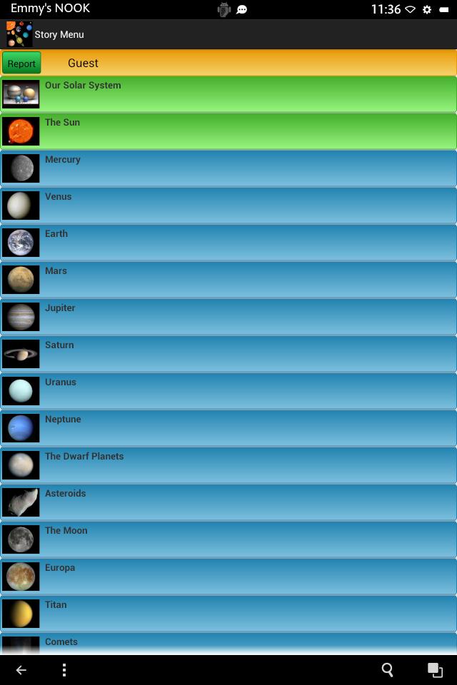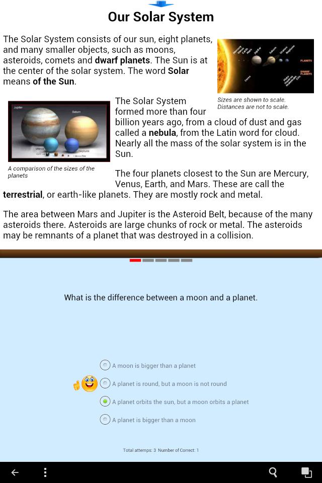 Diese Sachbuchverständnis-App enthält siebzehn Geschichten über das Solar System .