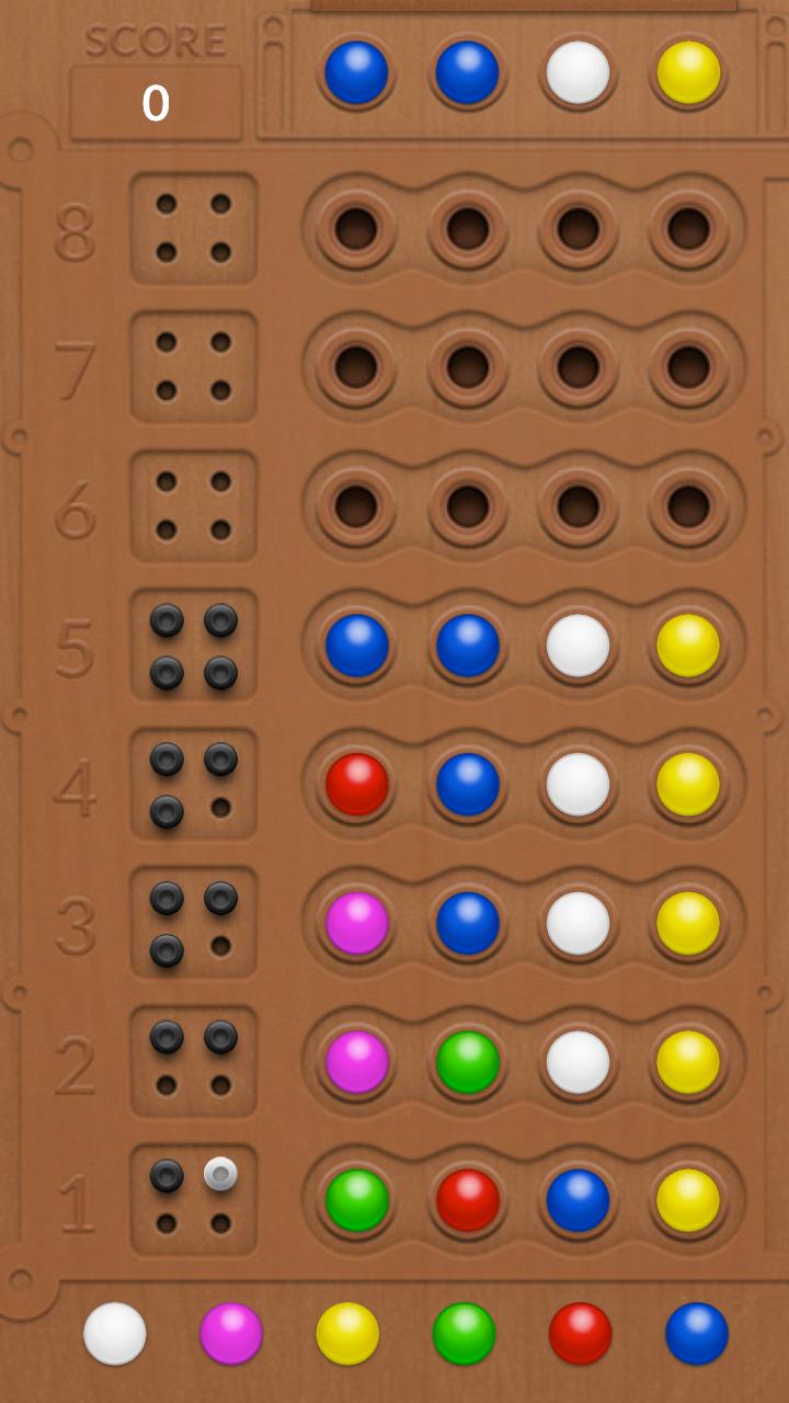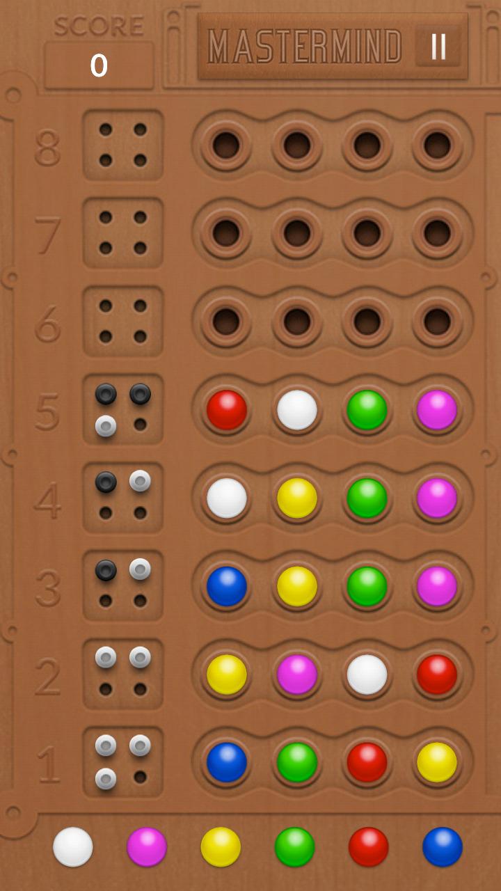 Mastermind ist ein Brettspiel, das auf einem Dekodierungsbrett mit einem Schild mit vier farbigen Stiften gespielt wird. Ziel ist es, den Code zu erraten und die versteckte Reihe in diesem Android -Brettspiel neu zu erstellen. Unter dem Schild befinden sich acht horizontale Zeilen, in denen der Player -Codebrecher die Farbe und das Platzieren der abgedeckten Stifte erraten kann. Auf der rechten Seite jeder horizontalen Zeile gibt es Löcher für PEGs, in denen die Software nach jedem Versuch, den Code zu erraten, Feedback für den Codebrecher bietet: