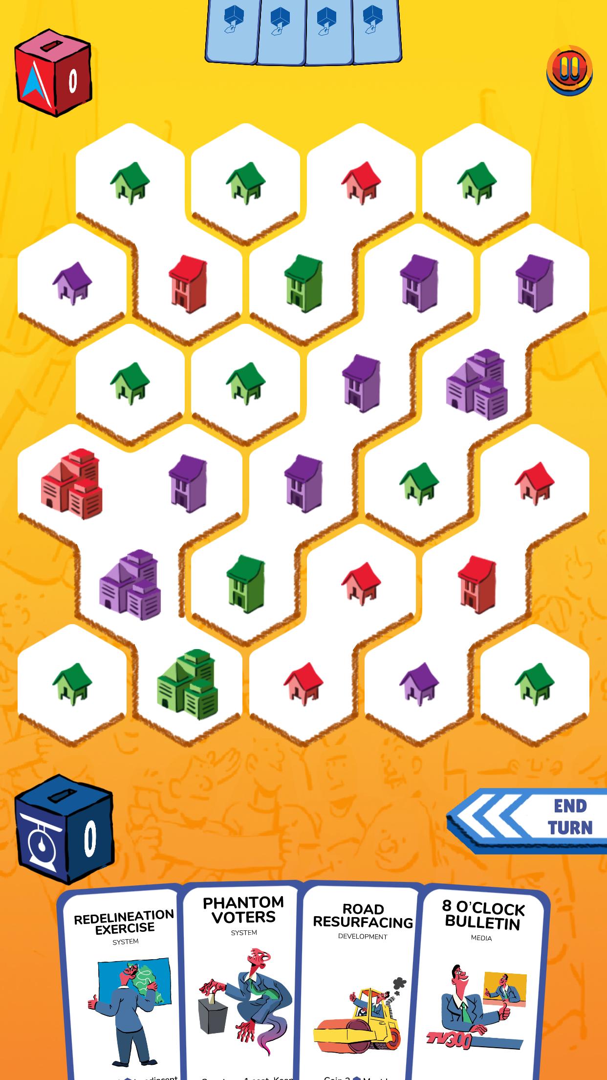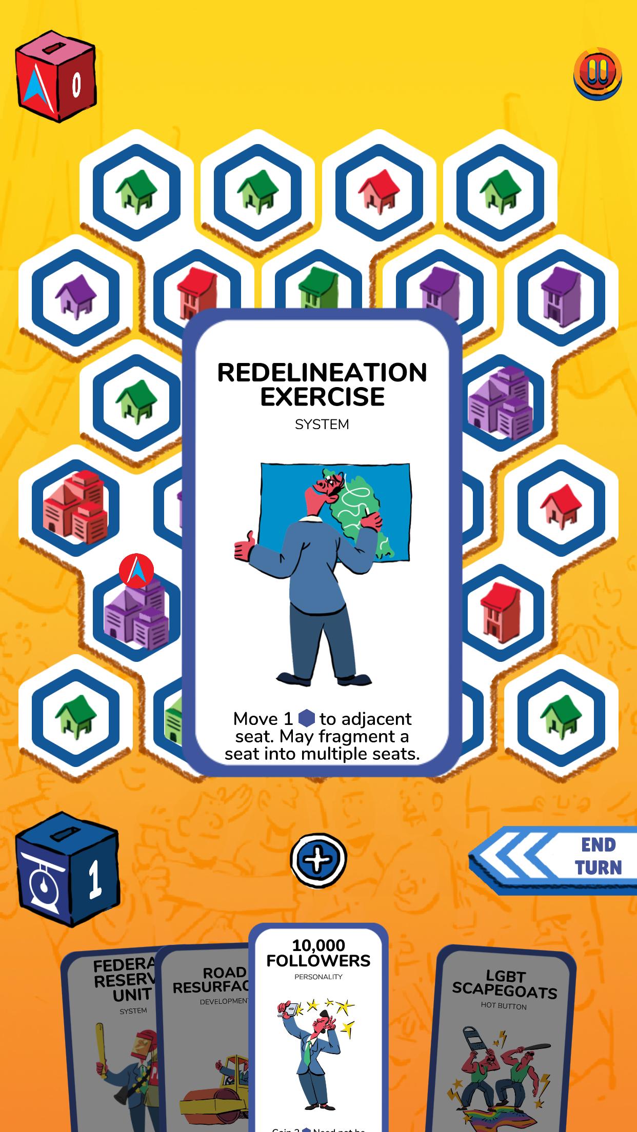 * Hex-Map simuliert die politische Landschaft. Wählen Sie, welche Sitze mit Bedacht gewinnen oder verlieren sollen!