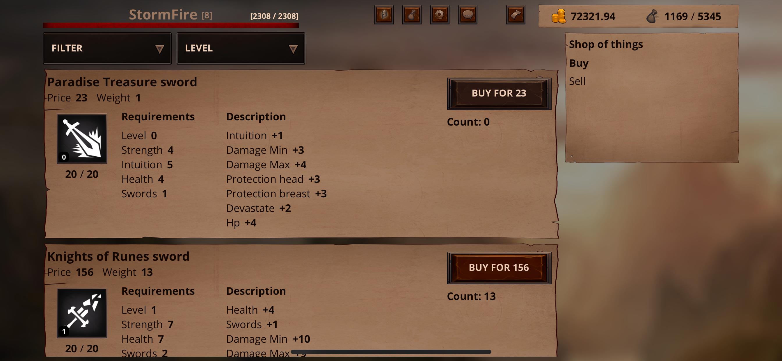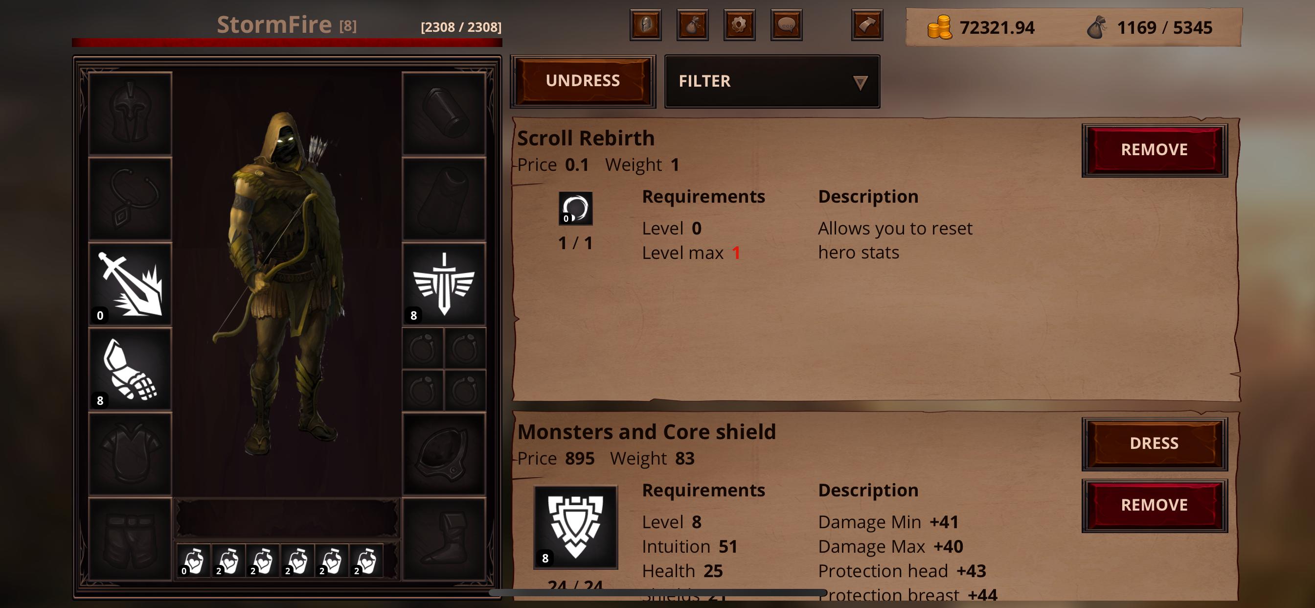 Der Held - Hauptsache ist die Ebene, Erfahrung und Dinge, die auf diesen Parametern, Fähigkeiten, Fähigkeiten, Modifikatoren, Schutz und Schaden basieren. Das Erhöhen von ihnen wird im Kampf stärker.