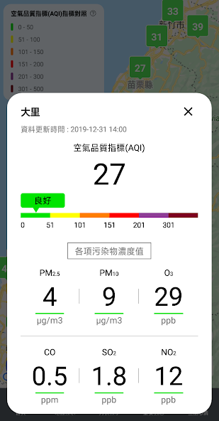 La aplicación integra perfectamente 6 índices diferentes para mostrar la información del entorno en tiempo real, como el Índice de calidad de ASAIR (AQI), la concentración de PM2.5, el índice ultravioleta (UVI), el índice de contaminación del río (RPI), el pronóstico meteorológico, etc., y se muestran en calibres y diferentes colores, para que los usuarios puedan entender cuán grave es, sin conocer la definición complicada de esos índices. Los datos de observación de sistemas de monitoreo de emisiones continuas recientemente agregadas ayudan a los usuarios a observar las fuentes de contaminantes particulares y evitar visitar áreas contaminadas específicas.