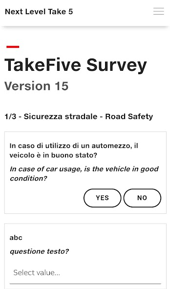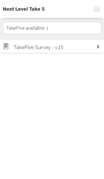 El siguiente nivel Take 5 admite la ejecución de encuestas de seguridad en el sitio. Los técnicos reciben la encuesta que necesitan para compilar directamente en su teléfono inteligente o tableta. Las preguntas de la encuesta son hechas por una persona responsable que puede enviarla a su propio personal de técnicos.