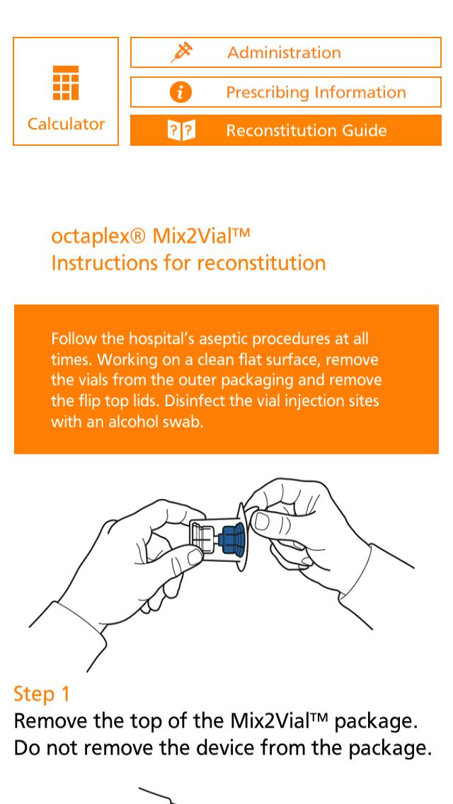 La aplicación Octaplex Dosing es para profesionales de la salud que administran Octaplex. La aplicación requiere el INR y el peso corporal del paciente y calculará la cantidad de ML y viales necesarios.