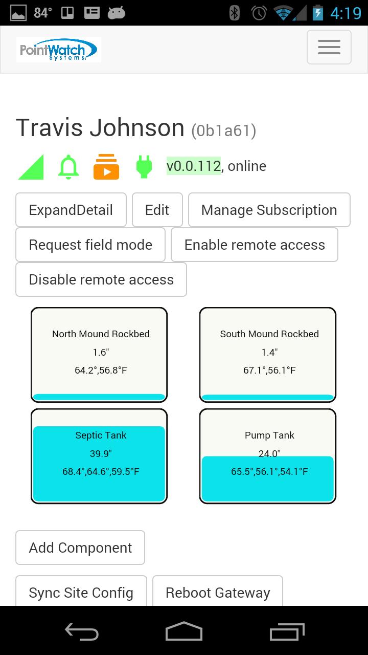 Con el monitoreo del sistema séptico Pointwatch , usted y su proveedor de servicios pueden ver el estado de todos los componentes de su sistema séptico en línea en cualquier momento y recibir alertas a su teléfono, computadora y dispositivo móvil. Los sensores de monitoreo en tanques, cajas de distribución y campos de drenaje proporcionan información en tiempo real sobre el nivel de líquido, la condición de la bomba y la temperatura en el sistema. Conocer el estado del sistema le permite optimizar el rendimiento de su sistema y evitar llamadas de emergencia o después de la hora.