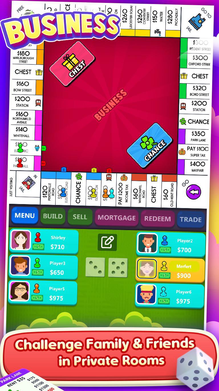 Business World Board Game es un juego de mesa inmobiliario para dos a seis jugadores. El tablero consta de 40 espacios que contienen veintiocho propiedades: (veintidós calles (agrupadas en ocho grupos de colores), cuatro ferrocarriles y dos servicios públicos), tres espacios de Oportunidad, tres espacios de Cofre Comunitario, un espacio de Impuesto de Lujo, un espacio de Impuesto sobre la Renta y los cuatro cuadrados de las esquinas: IR, (En) la cárcel/Sólo de visita, Estacionamiento gratuito e Ir a la cárcel.