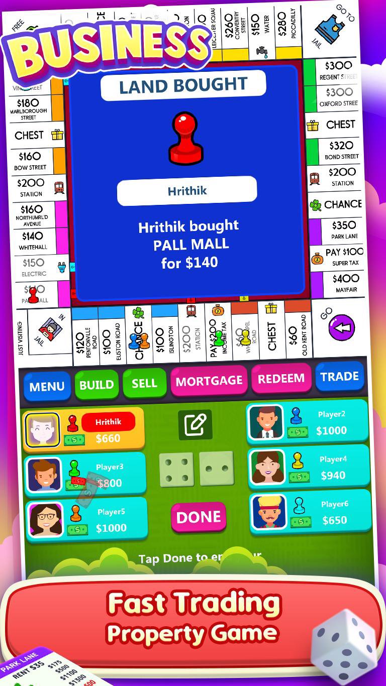Supongamos que un jugador adquiere un Business World , es decir, si un jugador posee todos los espacios dentro de un grupo de color, puede construir o desarrollar casas y hoteles iguales en estos espacios, generando aún más ingresos de los oponentes que aterrizan allí y deben pagarle el alquiler a ese jugador de acuerdo con el valor del terreno y de cualquier edificio en él.