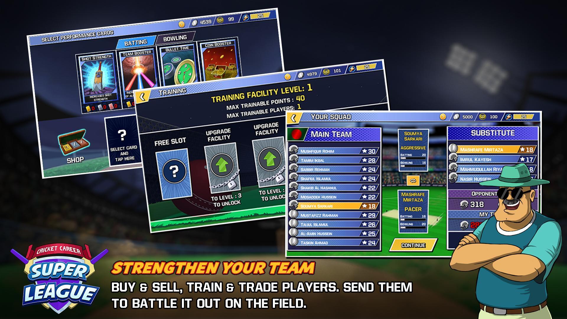 Cricket Career : Super League es un juego de cricket híbrido 3D que combina la gerencia con el juego Arcade para dar una experiencia única. Obtenga la experiencia completa del gerente de explorar instalaciones de entrenamiento, intercambiando a los jugadores a obtener recompensas para todos los logros. Juega cada partido para desatar el potencial de su jugador alcanzando las entregas súper Sixes y para tomar wicket o simular cada partido para un progreso gerencial más rápido.