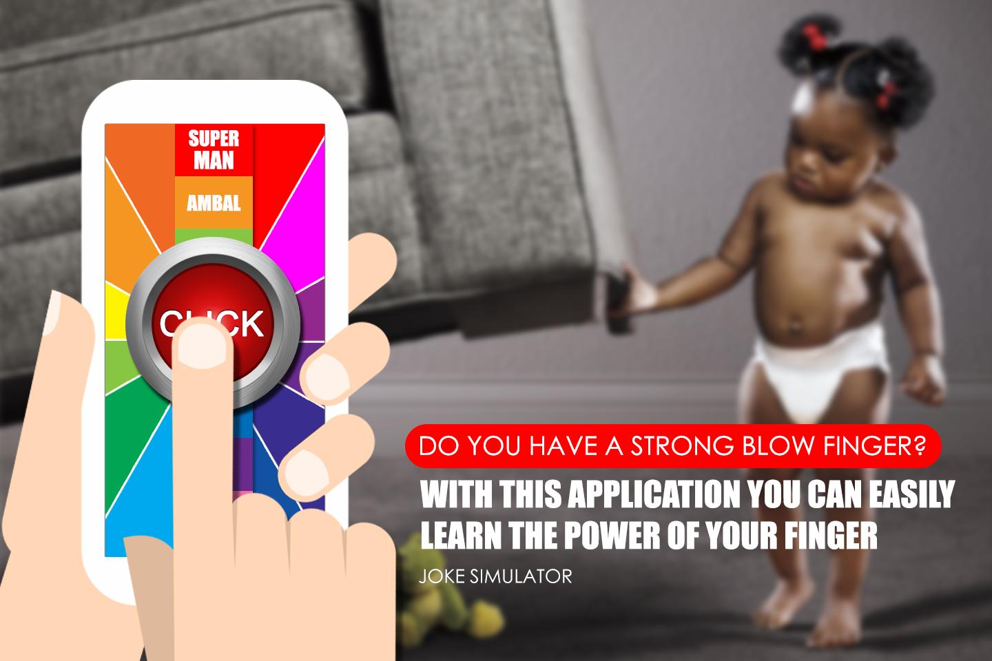 The power of your finger joke - Juego que imita la medición de tu fuerza, presionando y sosteniendo el dedo en la pantalla. Mantenga presionado el botón en la pantalla y pronto obtendrá el resultado de su fuerza. ¡Ponte a prueba a ti mismo y a tus amigos usando tus máquinas! Descubre lo que tiene el poder. ¿Puedes: Hulk, King Kong, un niño pequeño, Kingpin o quién? Coloque sus registros con sus amigos, compite en competiciones, fuerzas mer′tes '. Pero tenga cuidado, no triture la pantalla, ya que la aplicación es una broma y no podría realmente medir su dedo eléctrico, y produce resultados aleatorios.
