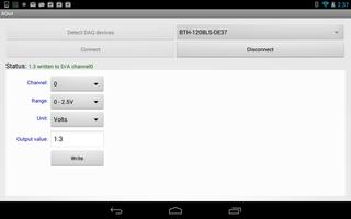 L'application de sortie analogique démontre l'utilisation de la bibliothèque universelle pour l'API Android ™ pour définir la valeur de sortie d'un canal D / A sur un dispositif d'acquisition de données de calcul de mesure (MCC) (USB, Bluetooth ou Ethernet).