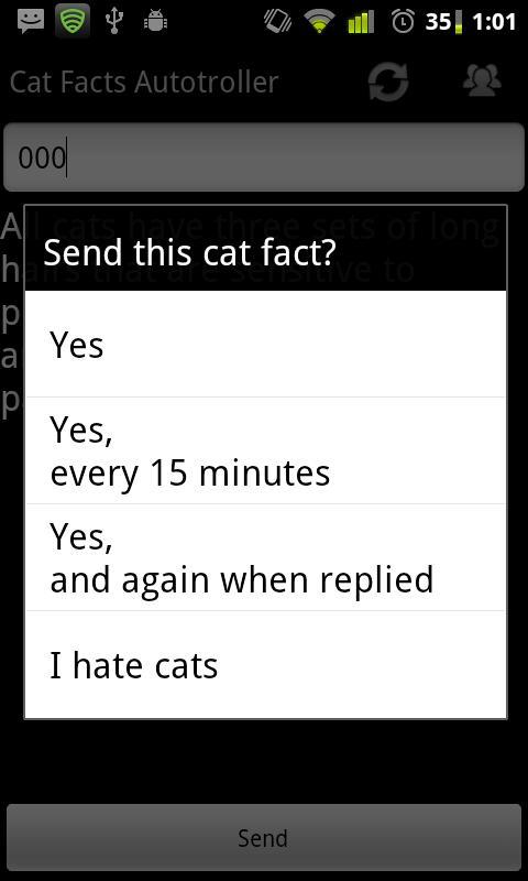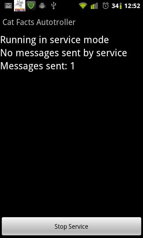 Envoyez des catfacts à vos amis. Plus de 100facts aléatoires avec la possibilité d'envoyer à intervalles réguliers. Le service peut également envoyer automatiquement plus de chats lorsque votre ami répond.