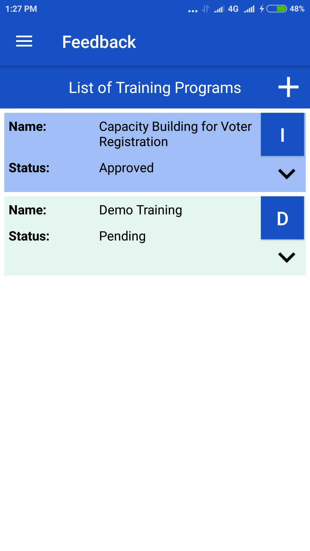 Les participants participant à l'un des programmes de formation menés par IIidem doivent s'inscrire à l'aide d'un identifiant de messagerie et d'un numéro de téléphone valides sur l'application. Les participants peuvent sélectionner le programme de formation pertinent dans la liste du programme dans leur tableau de bord après s'être connecté. Une fois que le responsable de la formation valide le participant, deux formulaires de rétroaction seront disponibles pour les participants, «formulaire de rétroaction de session» et «formulaire de rétroaction de formation». Les participants peuvent utiliser le «formulaire de rétroaction de session» pour exprimer leur opinion sur un formateur particulier et une session, tandis que le «formulaire de rétroaction de formation» peut être utilisé pour fournir des commentaires sur le programme de formation global. Une fois le formulaire de rétroaction soumis, il ne peut pas être récupéré par les participants.