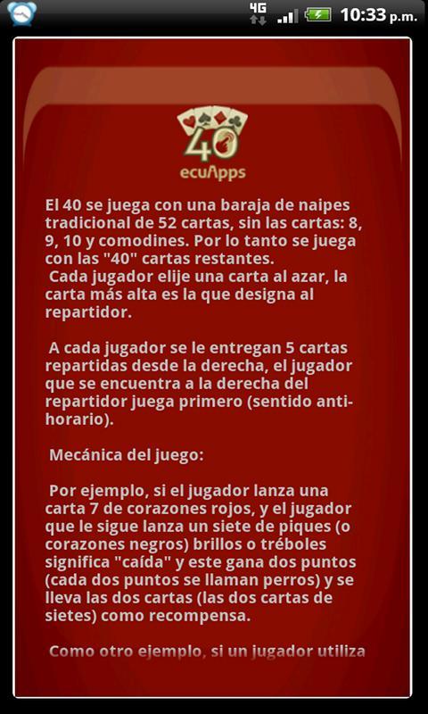 40 est joué avec un jeu traditionnel de cartes à jouer à 52, sans les 8, 9, 10, et les jokers. Pour cette raison, le jeu est joué avec les « 40 » cartes restantes. Le premier joueur qui gagne 40 points remporte le match.