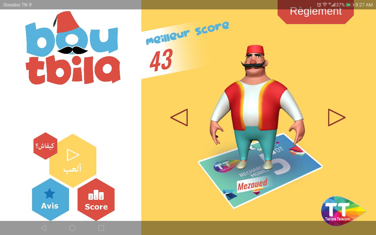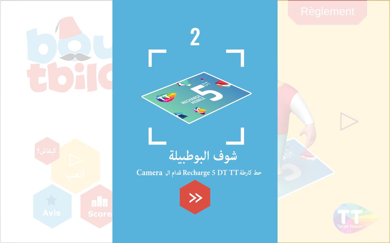 Boutbila est le réveilleur public au moment du “s’hour”. Il parcourt les rues avec sa timbale avant le lever du jour pour réveiller les dormeurs. Aujourd’hui, bien sûr, on a les réveils, les alarmes des portables. Tunisie Télécom vous fait revivre le moment, avec cette application, en visant la carte de recharge TT, le fameux personnage Boutbila apparaît, et lance le jeu. Le jeu commence des carreaux chronologiquement classés apparaîtront et les participants sont ainsi invités à toucher les carreaux noires afin de composer la chanson. “Boutbila” suivra le rythme afin de jouer la chanson avec son instrument. Jouez le jeu, obtenez le meilleur score et Tunisie Télécom vous fait gagner un smartphone.