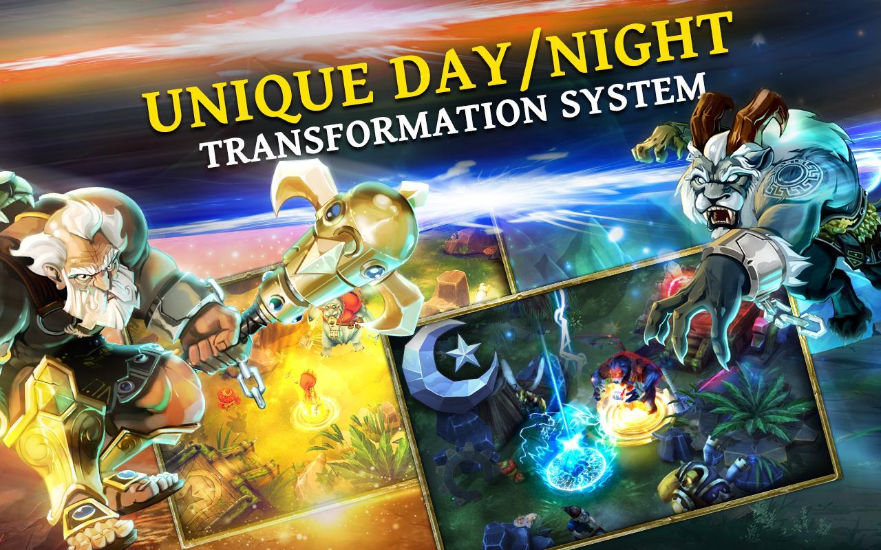 • Système de transformation de jour / nuit unique où l'apparence des héros, les statistiques et les capacités changent à mesure que le jour se transforme en nuit pendant la bataille