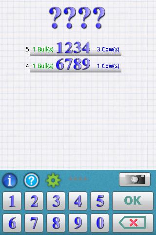 Android writes a 4-digit secret number. The digits must be all different. Then, the player try to guess the number. Android gives the number of matches. If the matching digits are in their right positions, they are "bulls", if in different positions, they are "cows".