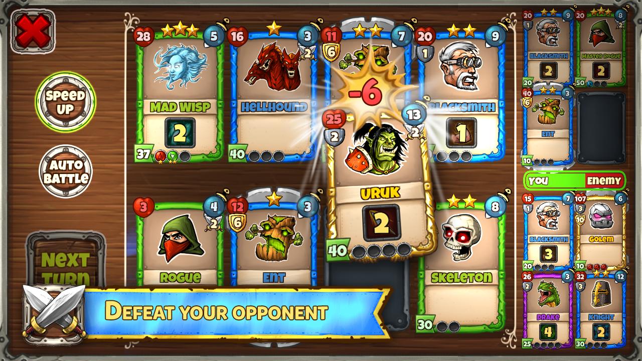 Start and become owner of famous heroes. Fight battles on your adventure and improve heroes. At the end of each part is challenge for you. You have to defeat strong and dangerous boss. Defeat bosses and loot treasures in campaign and PvP online Arena. Come regulary co complete daily quests to get extra rewards. Upgrade and forge better cards and imbue them with tokens. Evolved heroes with special abilities that can help you – heal your team, increase damage or armor.