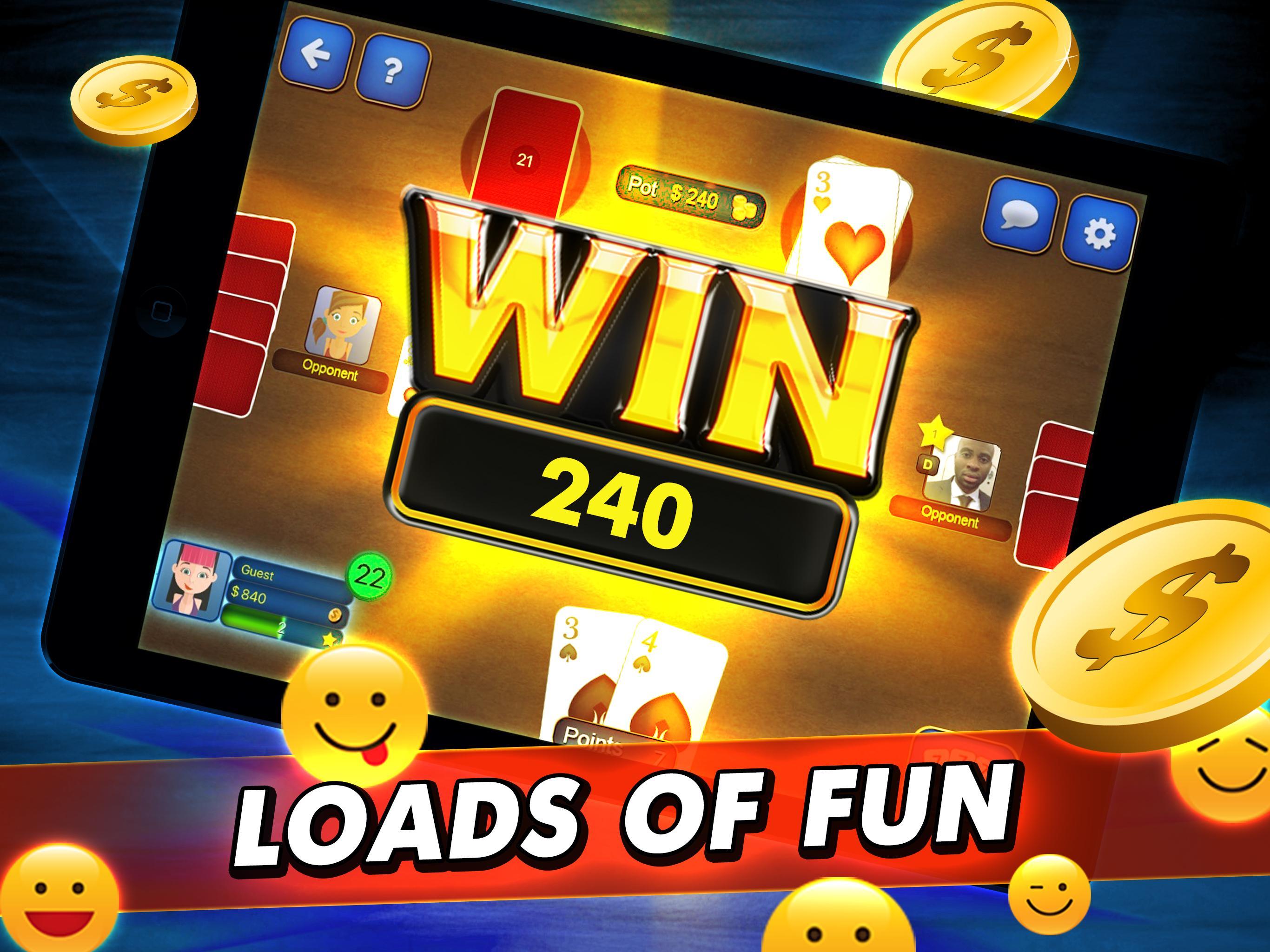 4) The winner is the player with least points, and scores the sum of the differences between this and the points in each other player's hand. Example: A has 6; B has 15; C has 7. A is the winner.