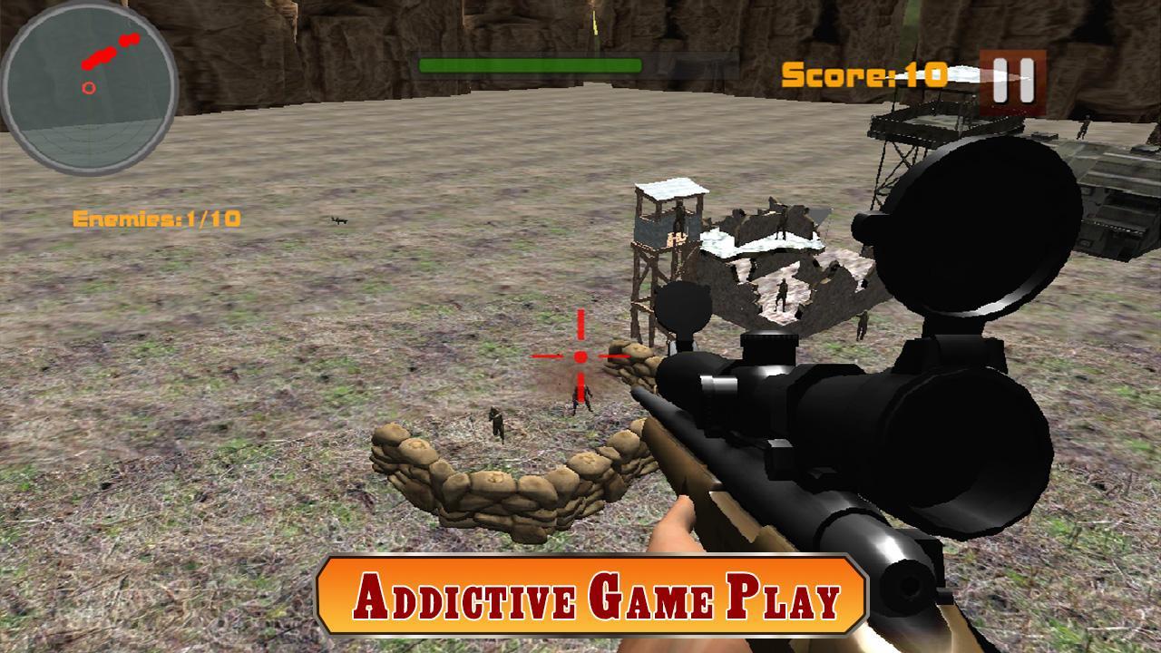 Experience 5 separate missions based on actual war effects. Allied troop’s prior authorization powerful tank and destroy the enemy base. It's hard to grab a gun and blank against fortified positions. You will need to use special sniper gun and stunning graphics and controls the correct enemy soldiers. Survive the Clash with enemy and prove your battle skills;