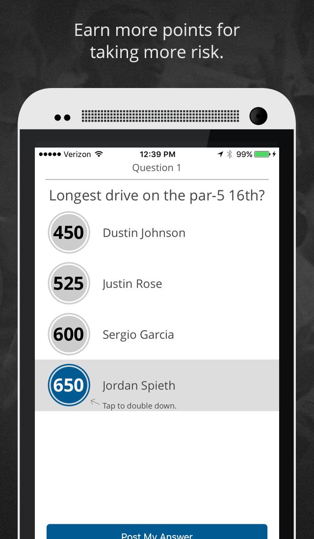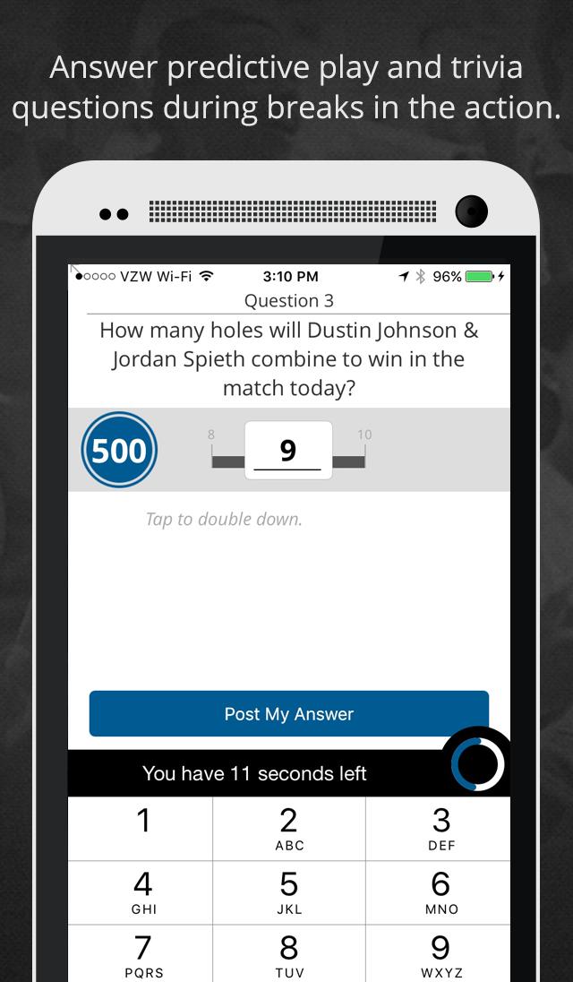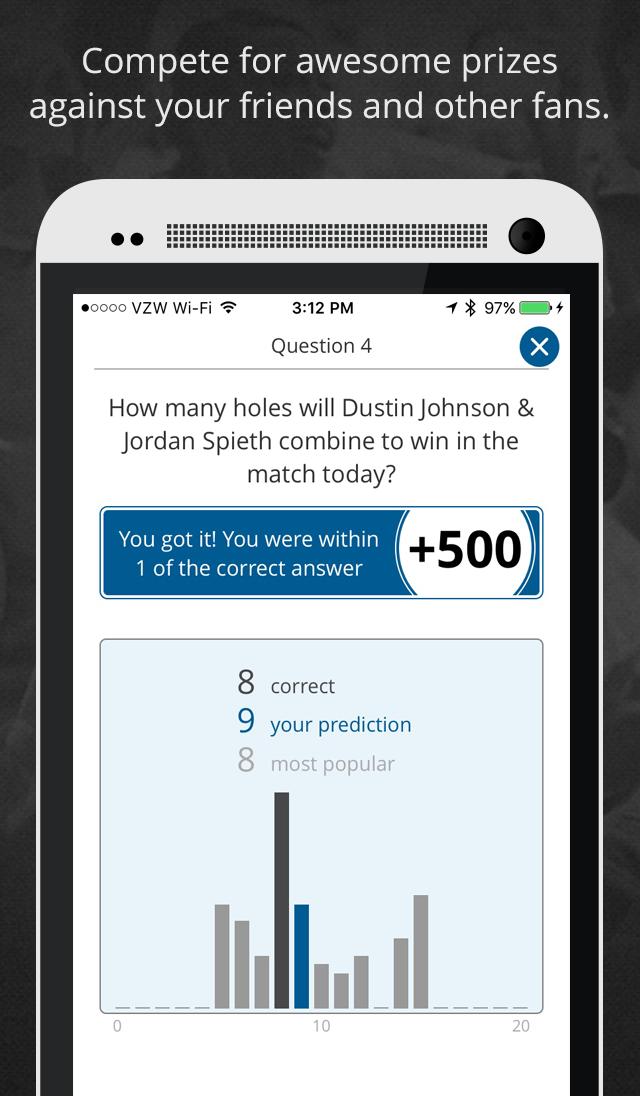Compete against your friends and other fans to predict what will happen during your favorite sporting event. Who will hit it closest to the pin on the next par 3? How many yards on Jordan Spieth’s next drive? In what year did the U.S. last win the Ryder Cup?