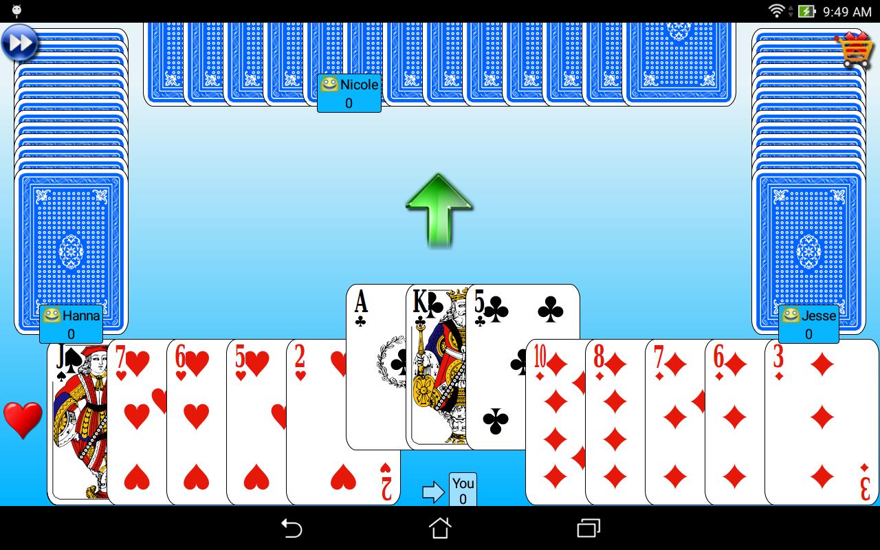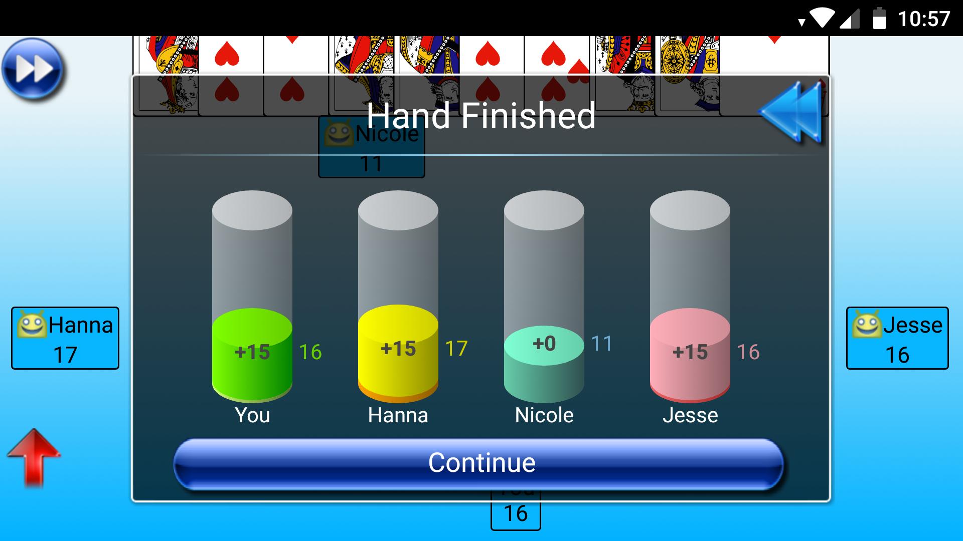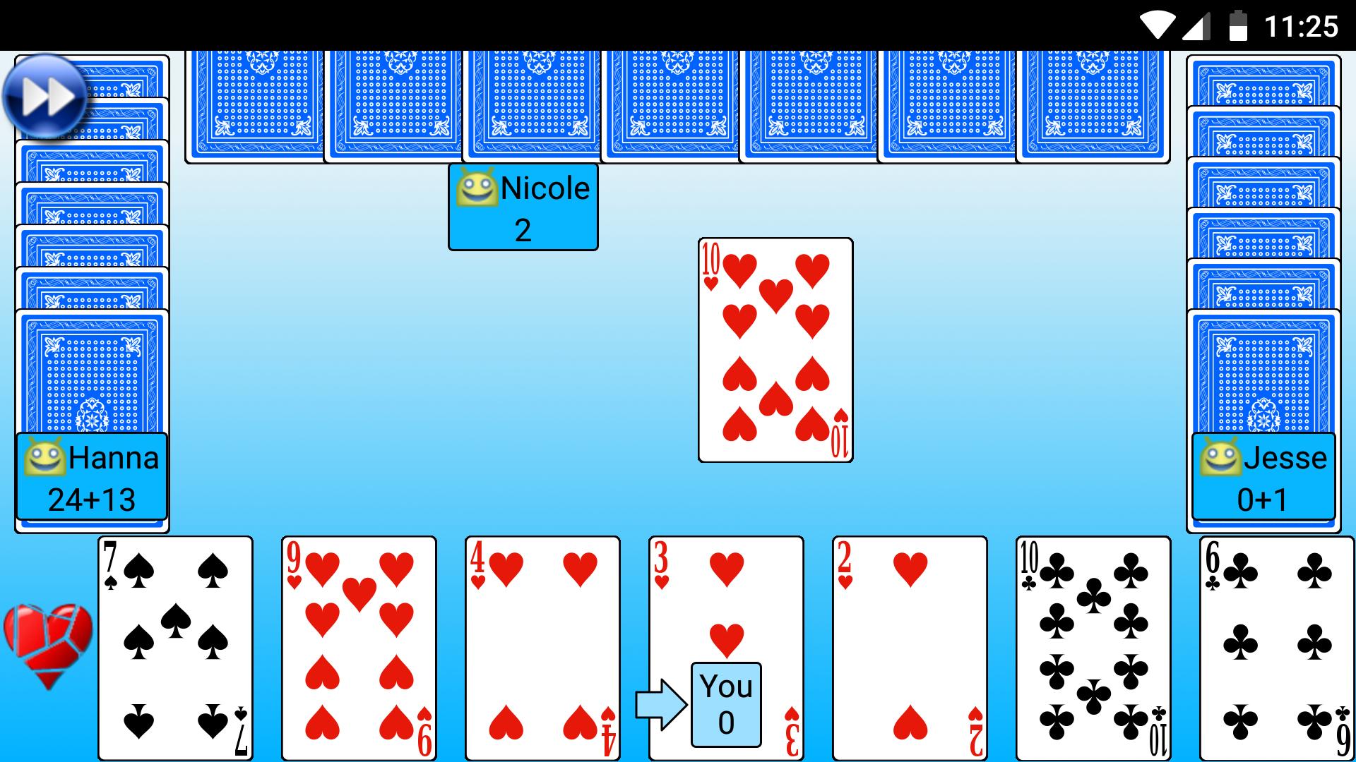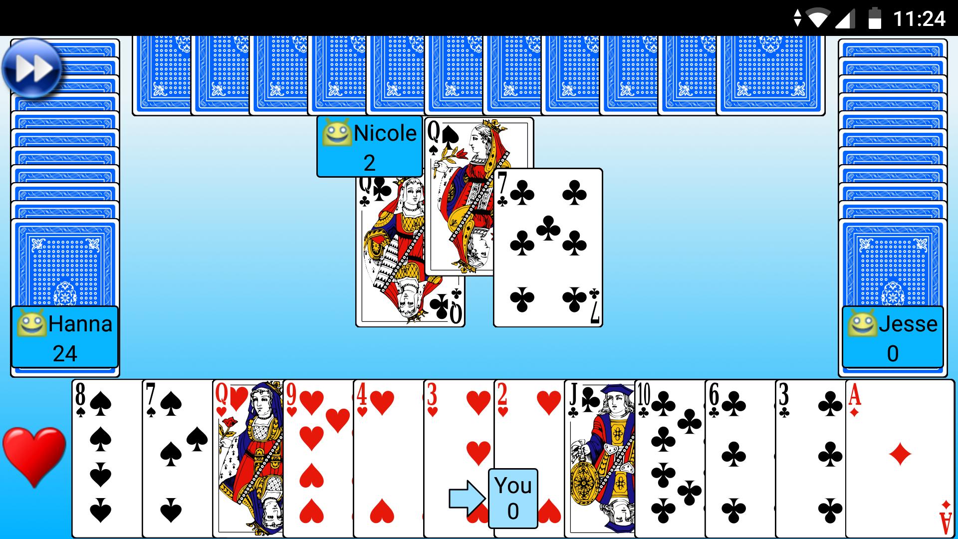 In this app we offer two distinct Hearts variants. The first variant is standard US/international Hearts where the deal consists of 13 cards per player and the object of the game is to score as few points as possible.