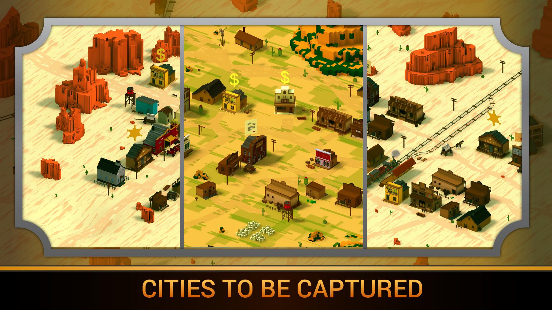 Prairies, deserts, plains, and cities—all in colorful 3D graphics. Travel, upgrade your character, and win duels! Wage war with whoever you don't choose—Sheriff or Robber, Cowboy or Outlaw—by capturing cities from them one by one until you dominate their entire state. Become the best Gunslinger.