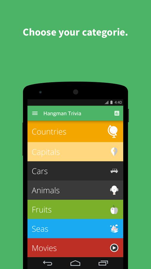 Hangman Trivia the best classical word guessing game ever, Play Hangman and try to guess words to avoid a grisly fate, Choose your category and begin your adventure.